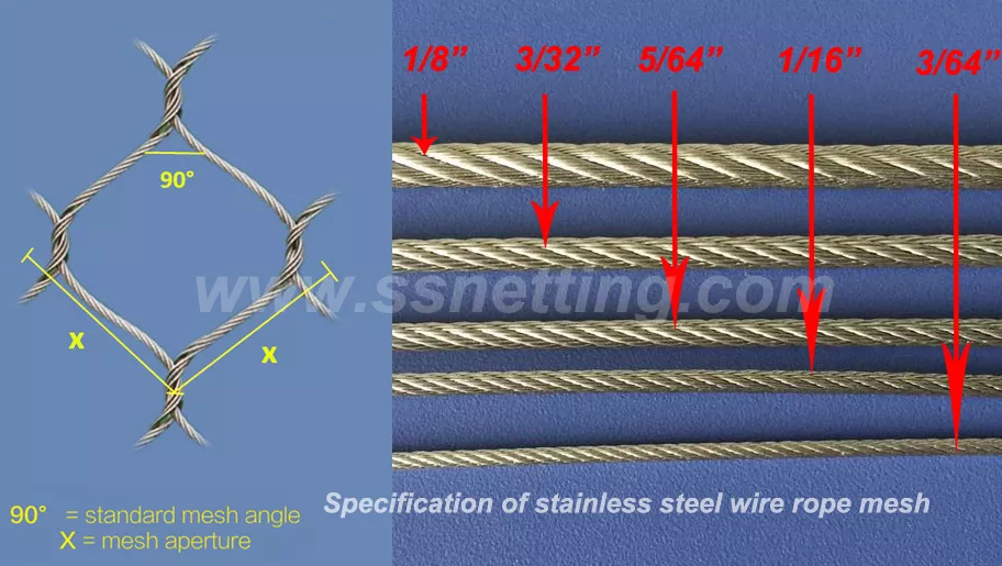 Stainless steel cable mesh material is used high quality stainless steel wire cables, the stainless steel wire rope grade includes type 304, type 316. The structures of the stainless steel wire cable have 7 x 7 and 7 x 19. The standard stainless steel wire cable diameter includes 1/8″(3.2mm), 3/32″(2.4mm), 5/64″(2.0mm), 1/16″(1.6mm), and 3/64″(1.2mm), the standard mesh opening size includes 4/5″ x 4/5″(20mm x 20mm), 1″ x 1″(25.4mm x 25.4mm), 1-1/2″ x 1-1/2″(38mm x 38mm), 2″ x 2″(51mm x 51mm), 3″ x 3″(76mm x 76mm) and 4″ x 4″(102mm x 102mm), or larger.