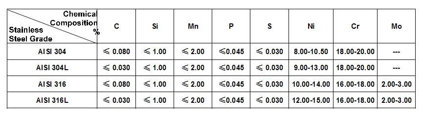 ▼ Composition of AISI 304, 304L, 316 and 316L material stainless steel wire rope mesh