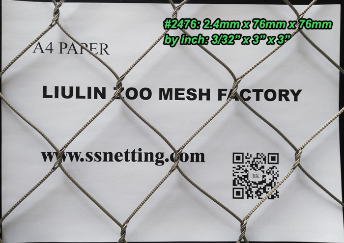 The stainless wire mesh panels code #2476: with diameter 3/32″(2.4mm), aperture 3″ x 3″( 76mm x 76mm) suitable for large animal enclosure fence netting mesh, like Monkey enclosure mesh, Gorilla cage fence, Deer cage fence, fox enclosure mesh, and other similar animal fence netting.