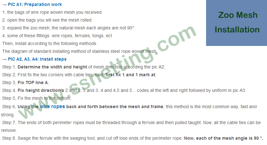 Due to the uncertainty of construction sites and the difficulties of construction personnel and equipment, we generally do not provide on-site installation services of stainless steel wire rope mesh. But for the installation of difficulties, not installed, etc., we can provide graphic, video, home installation guide and other means to ensure that customers can rest assured that the installation of stainless steel rope mesh.